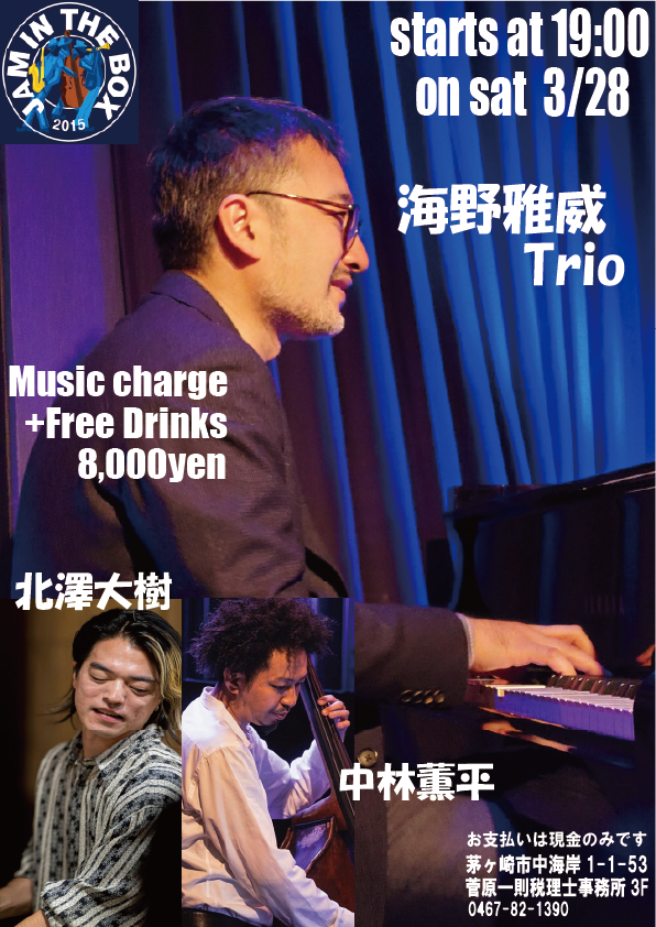 海野雅威の新しいTrio。Bassは中林薫平。Drumsは北澤大樹。乞うご期待!!!!!